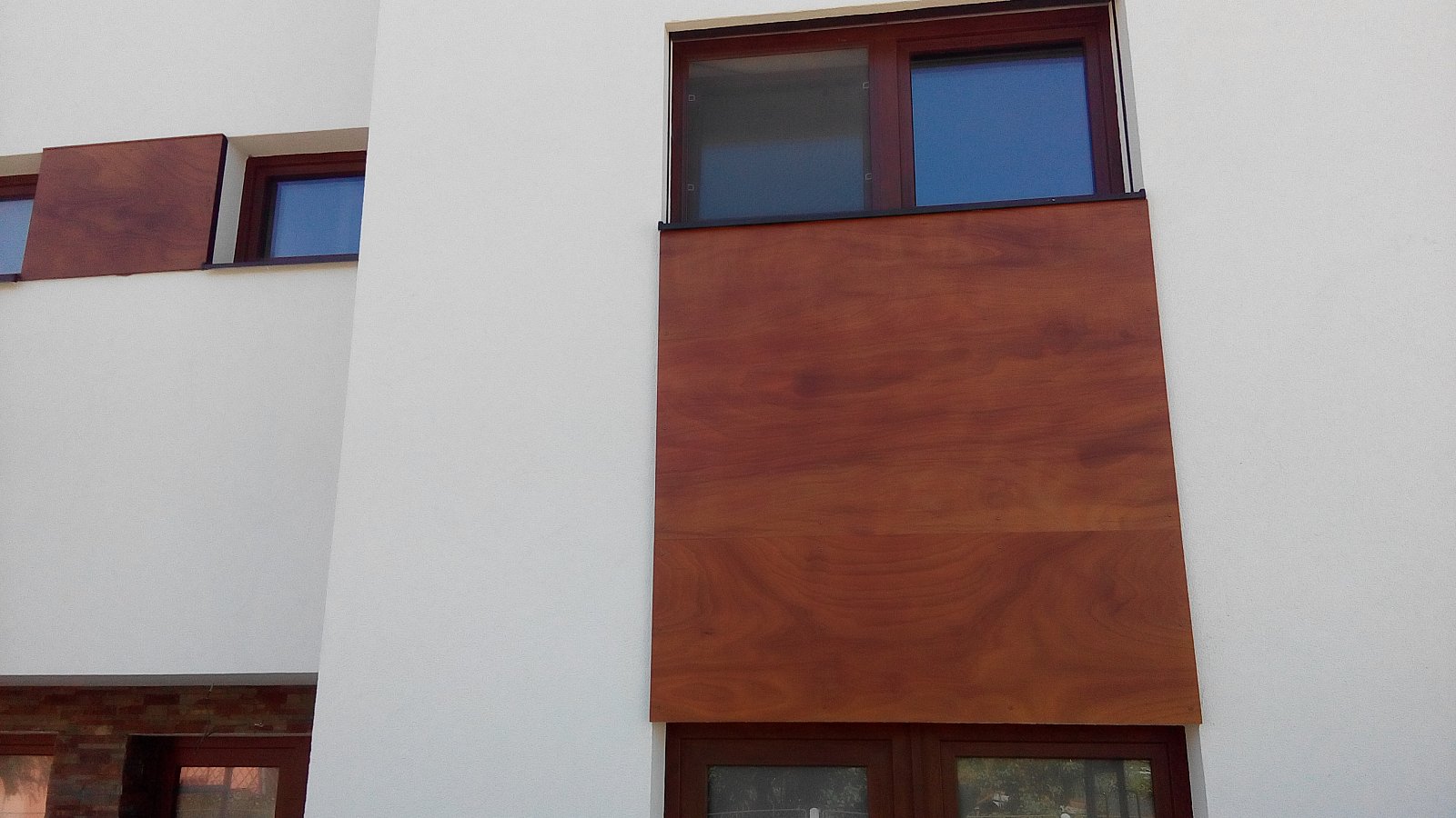 Obklad Parklex Copper, upevněn velkoplošnými nýty.