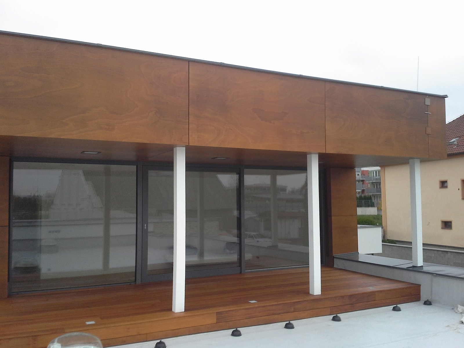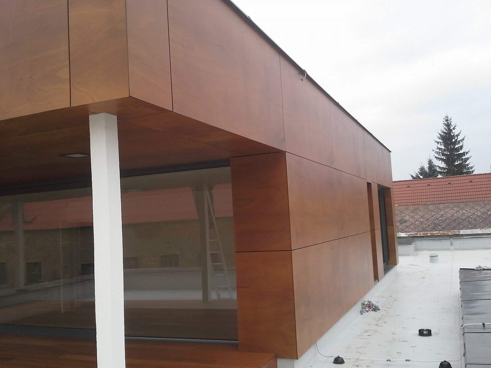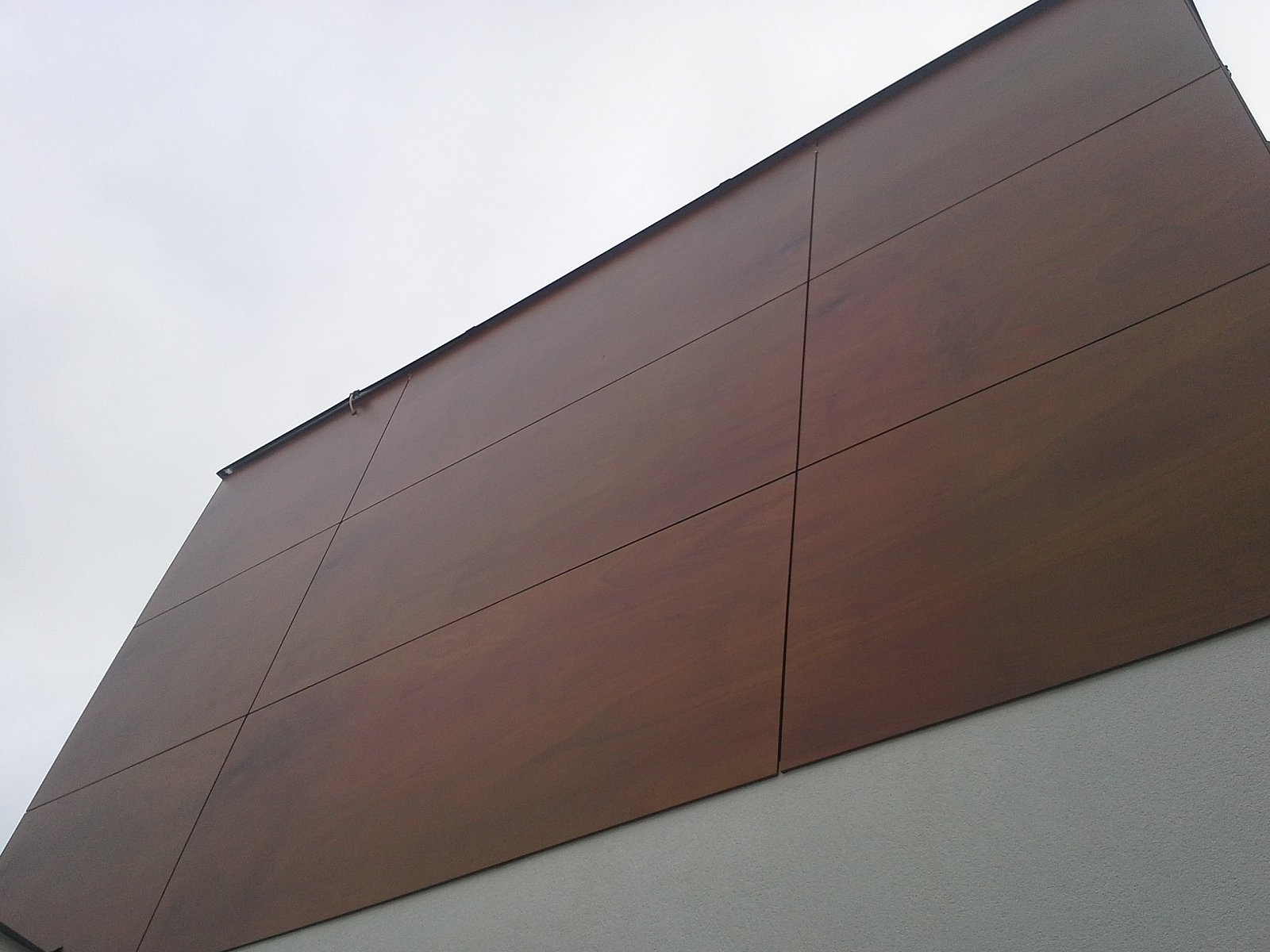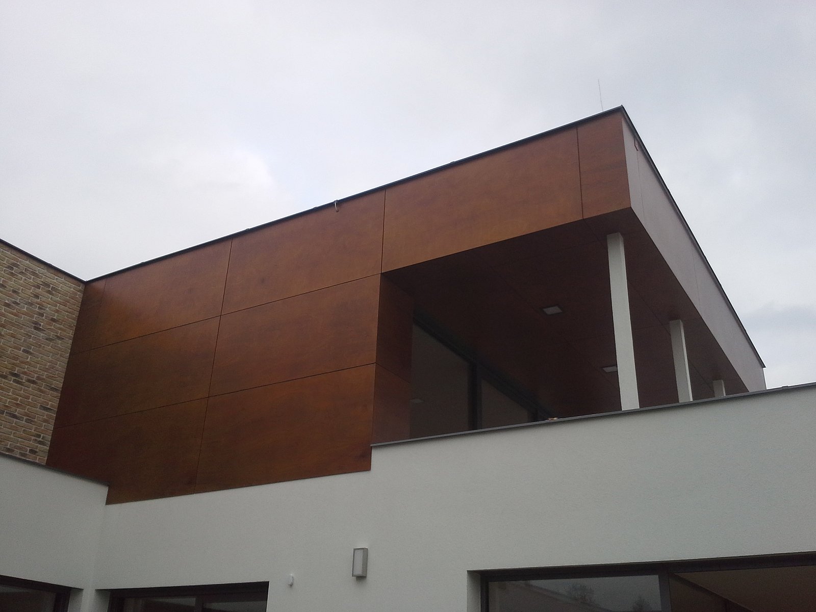 Realizace RD Praha Kbely 2014. Parklexová fasáda odstínu Copper, uchycená lepením na AL konstrukci.