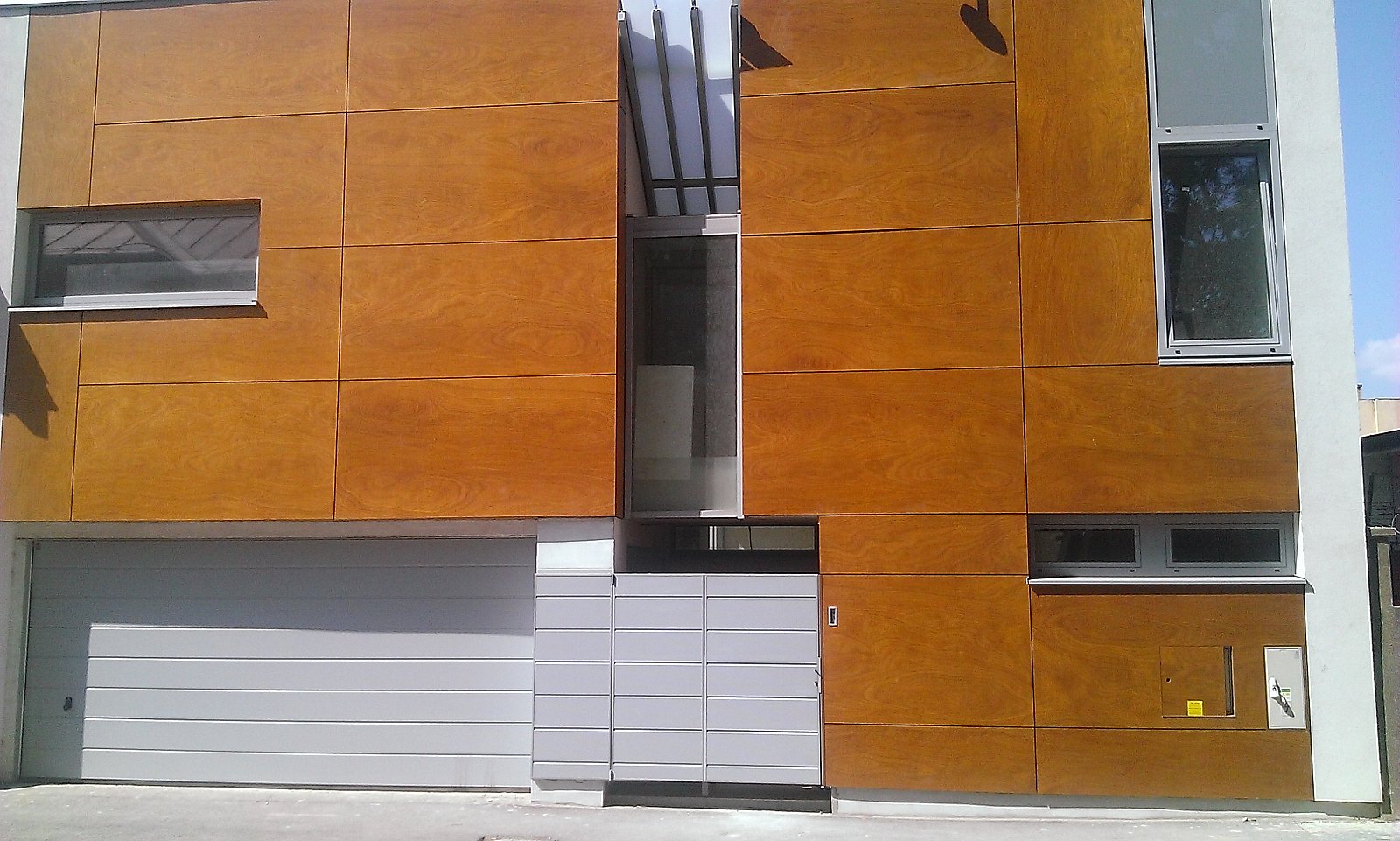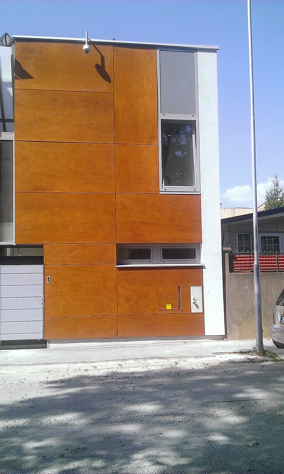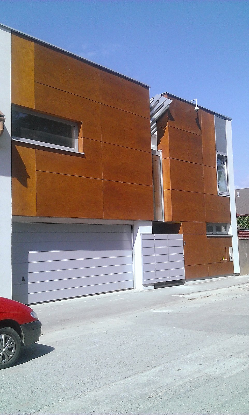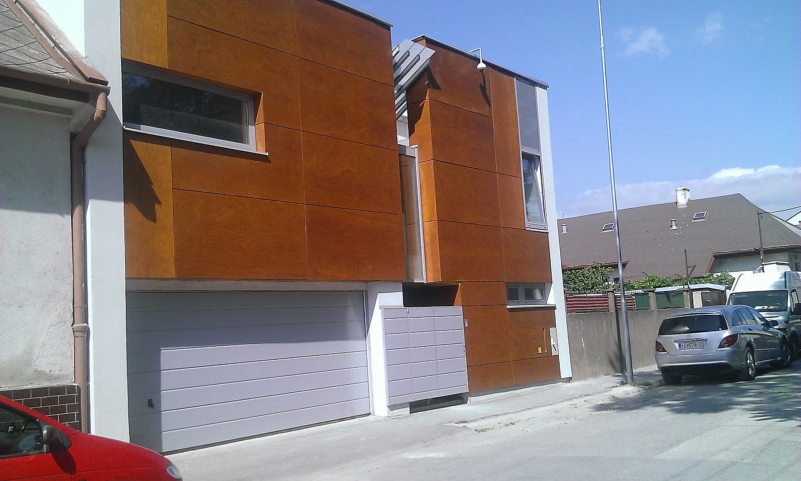 Realizace parklexové fasády v Košicích. Obklad Parklex Copper, uchycený lepením.