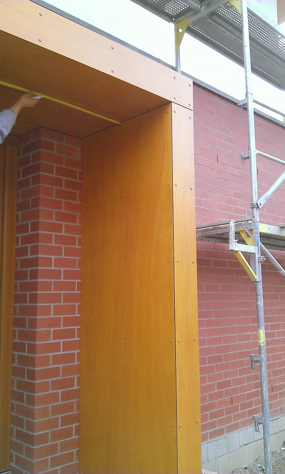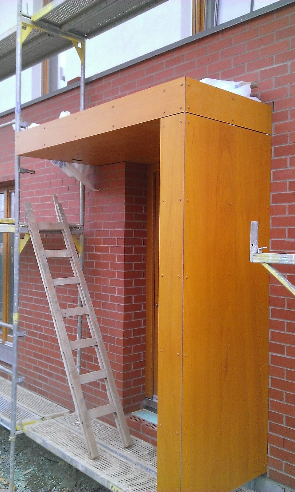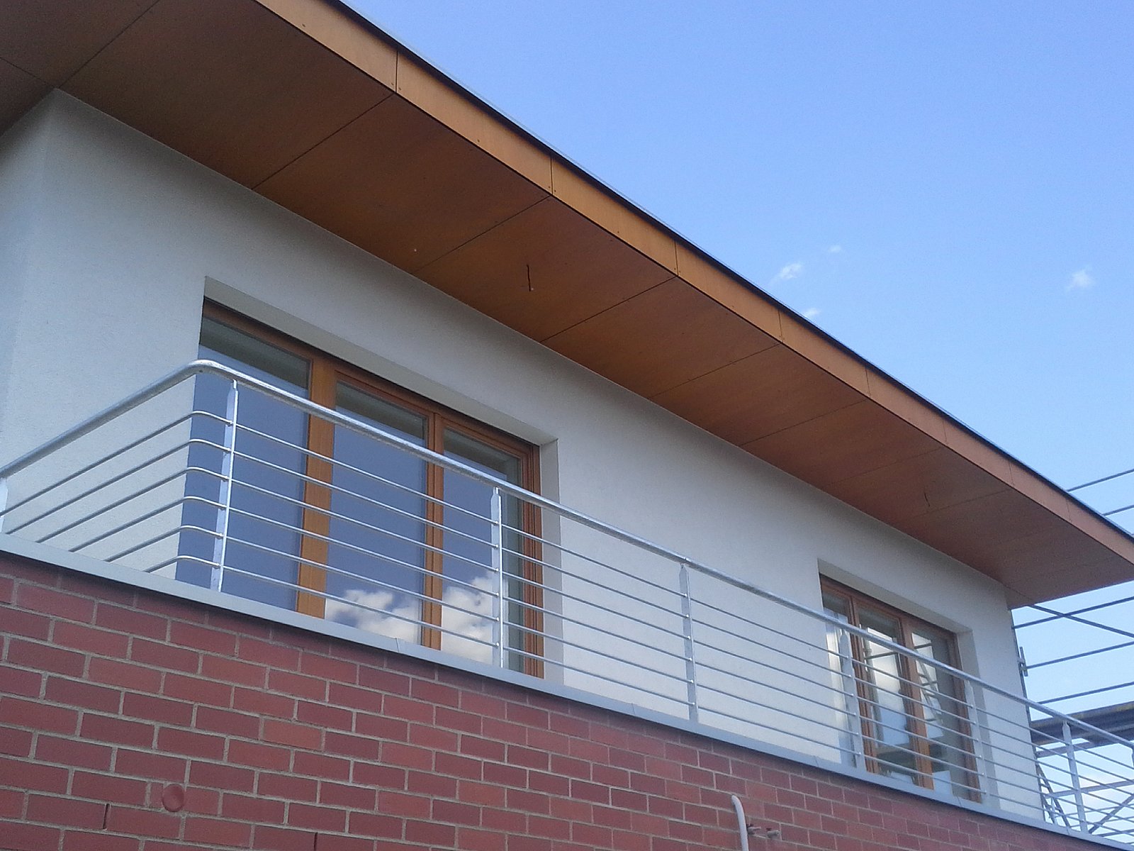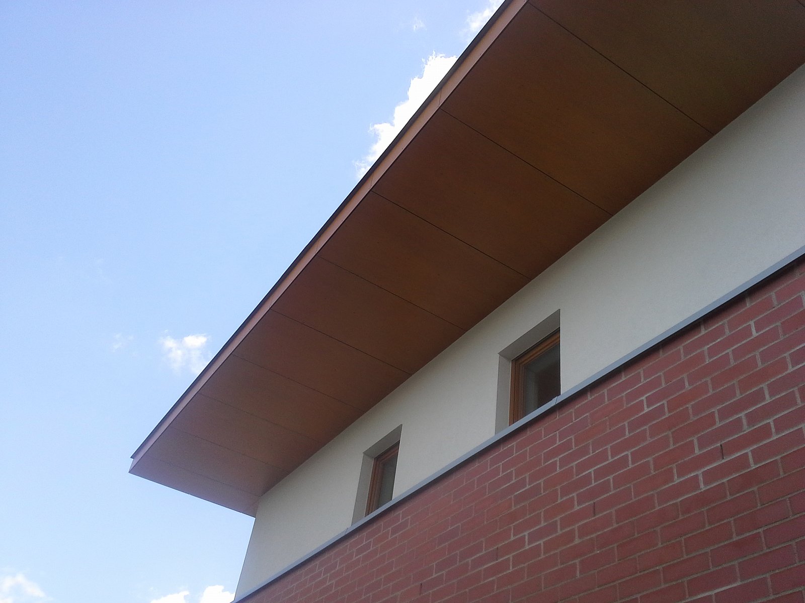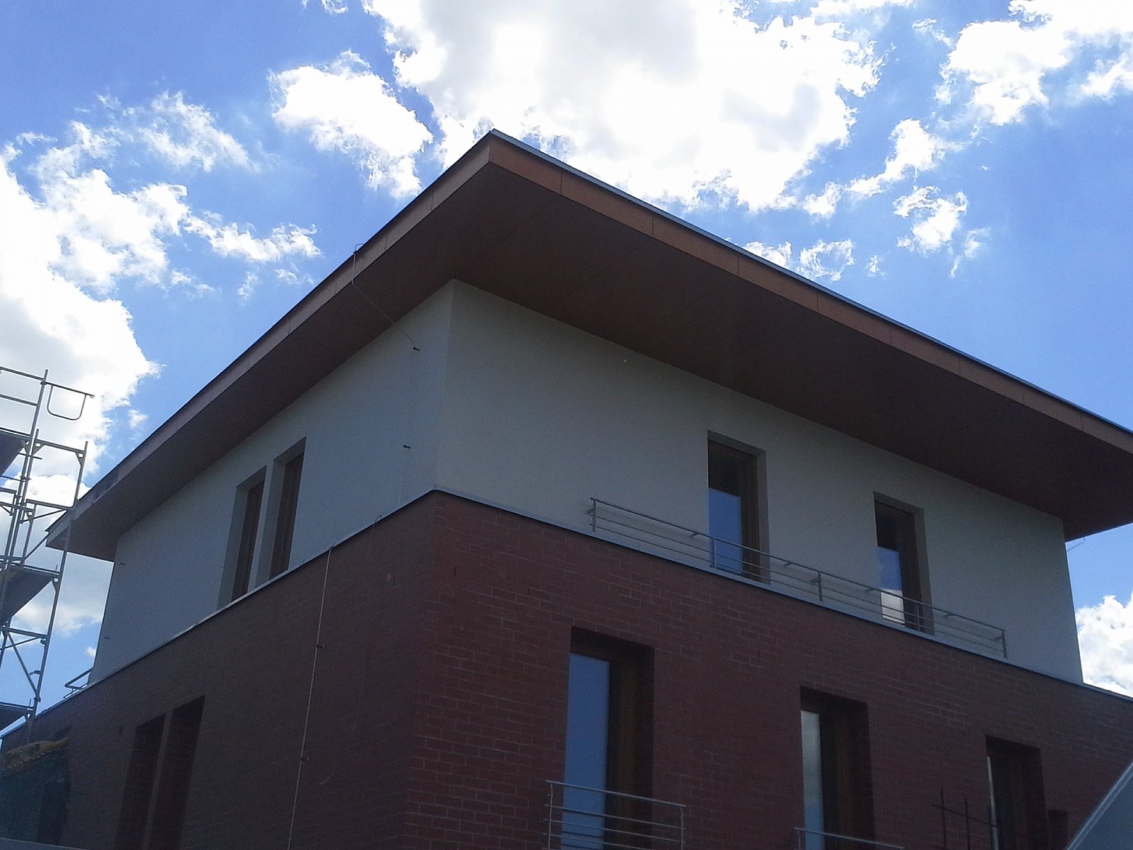 Realizace parklexové fasády na rodinném domku v Praze. Obklad Parklex Gold, uchycený velkoplošnými nýty.