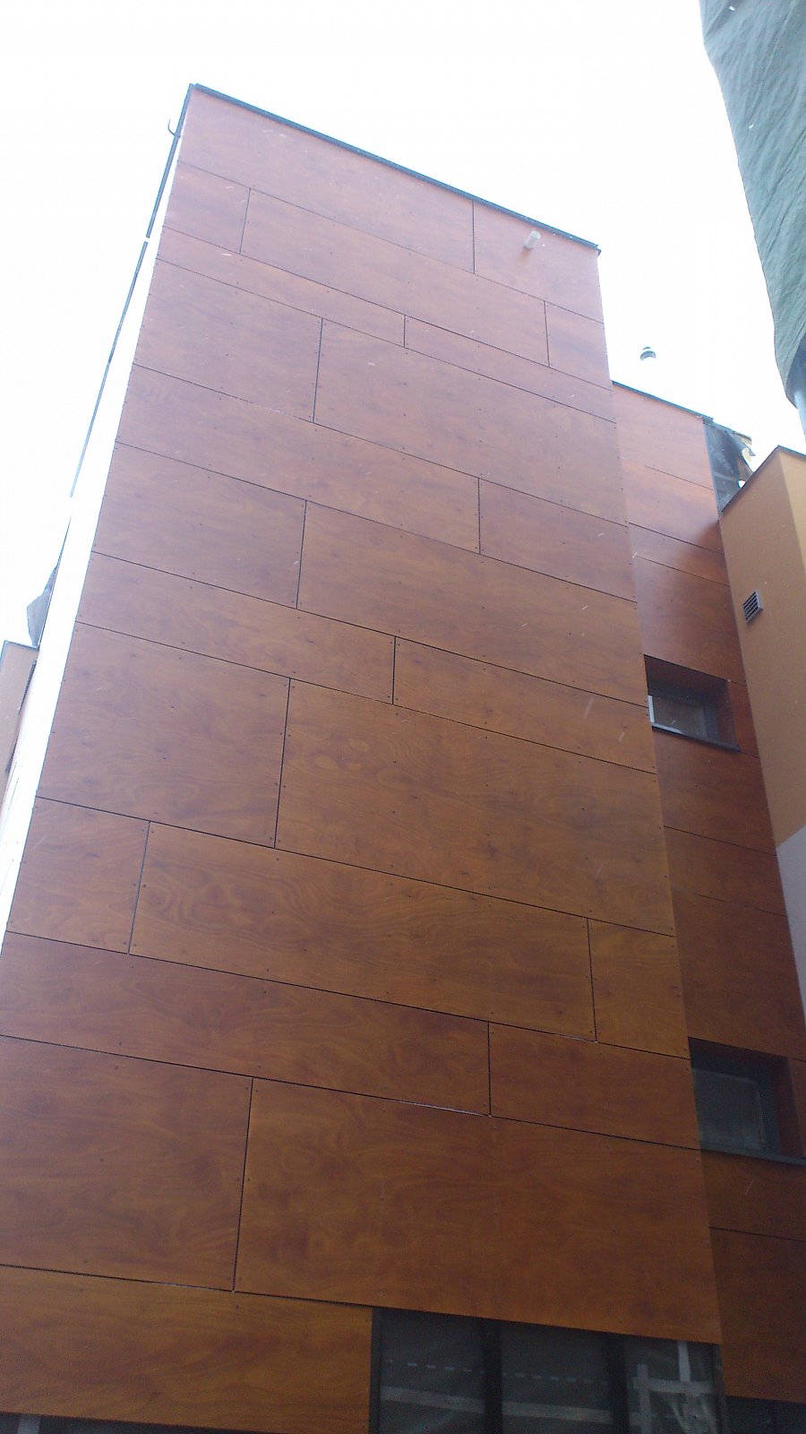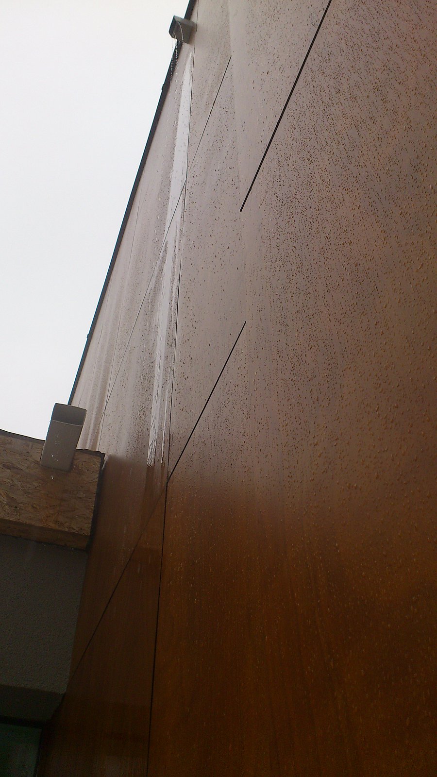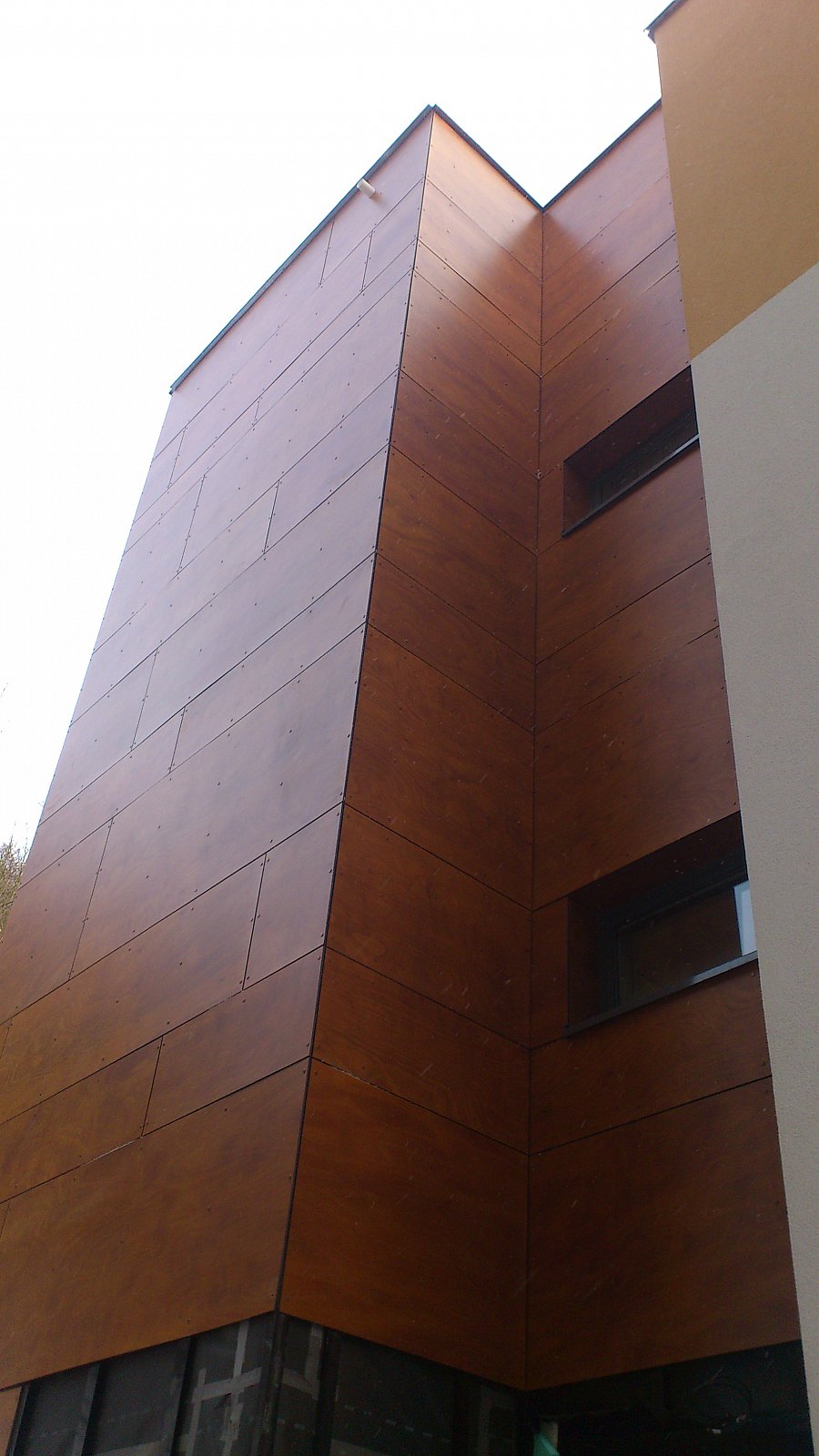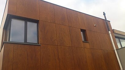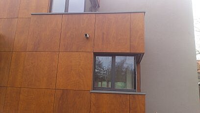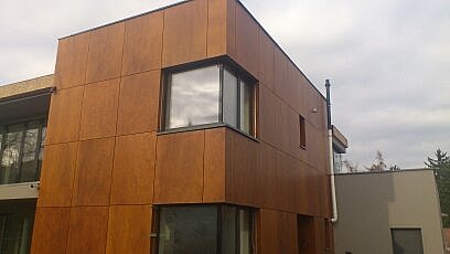 Realizace parklexové fasády na rodinném domě v Kunraticích. Obklad Parklex Copper, uchycený lepením.
