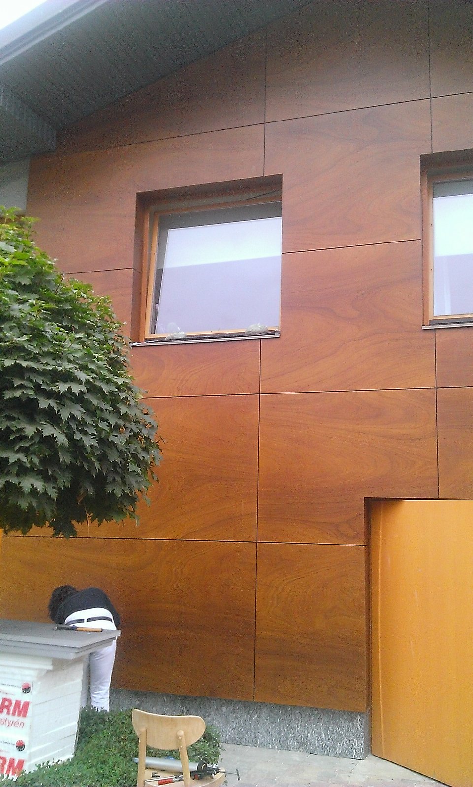 Realizace parklexové fasády na rodinném domě v Partizánské Lupče na Slovensku. Obklad Parklex Copper upevněn lepením na AL konstrukci