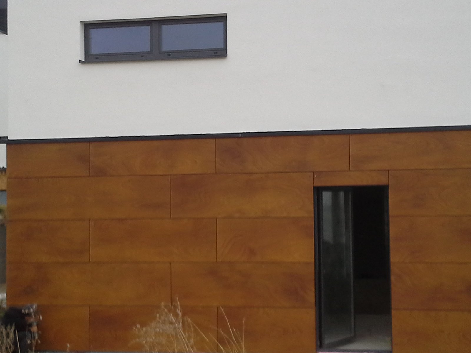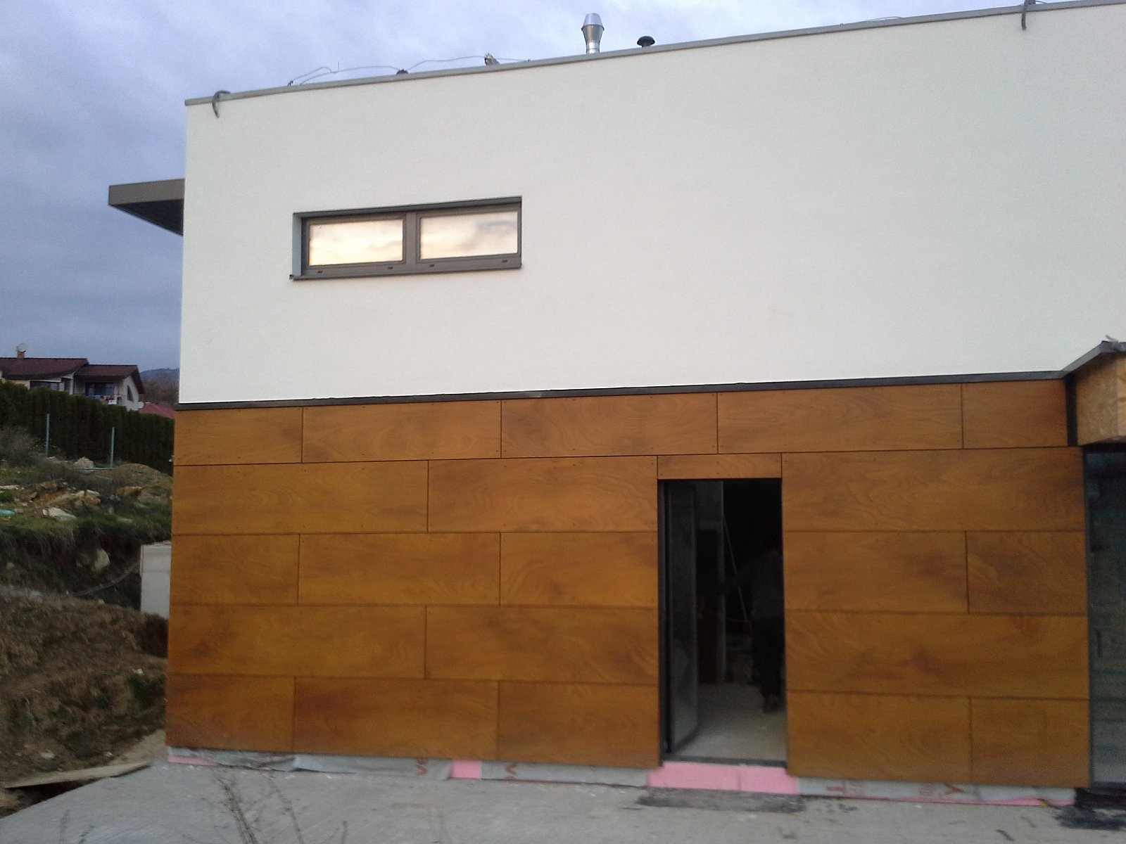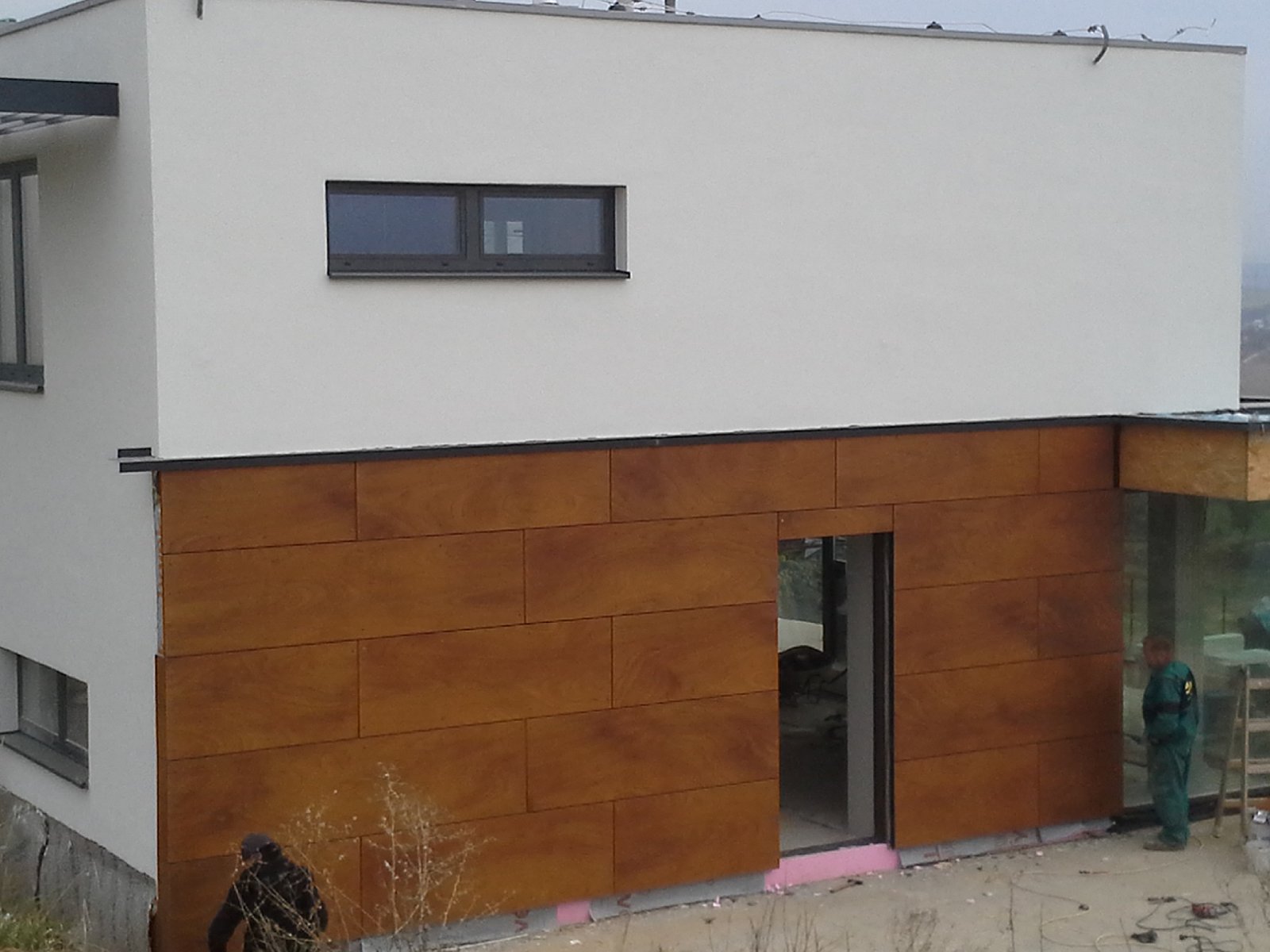 Realizace parklexové fasády na rodinném domku ve Zvoleni. Obklad Parklex Gold, uchycen velkoplošnými nýty.
