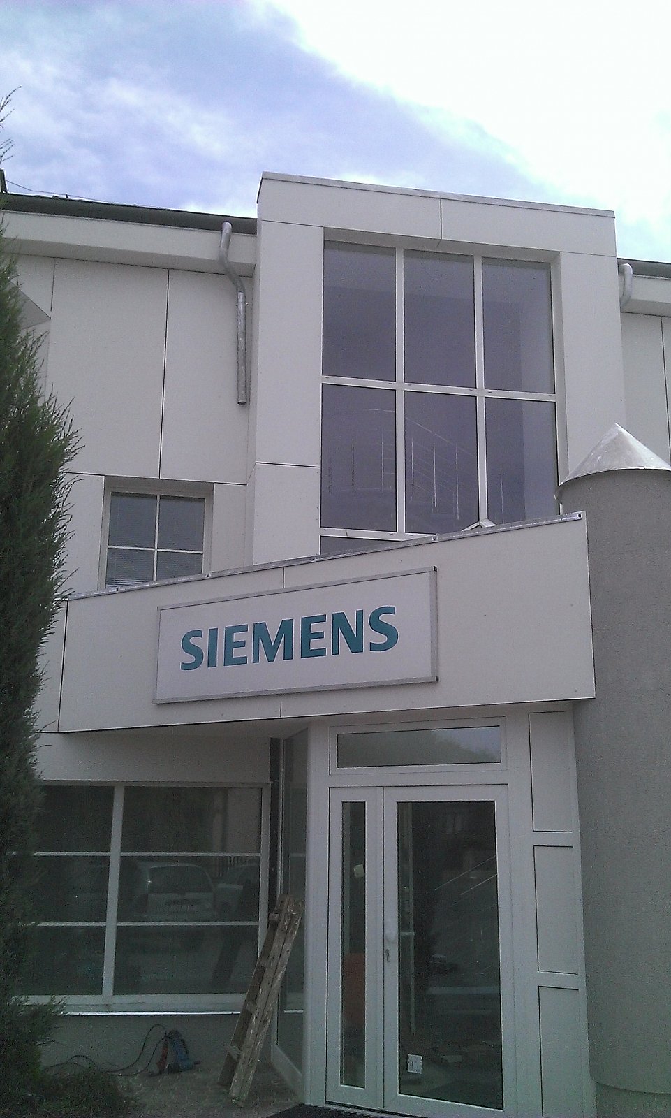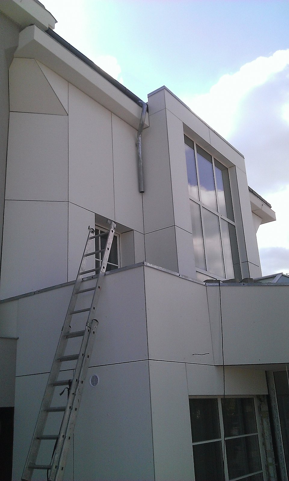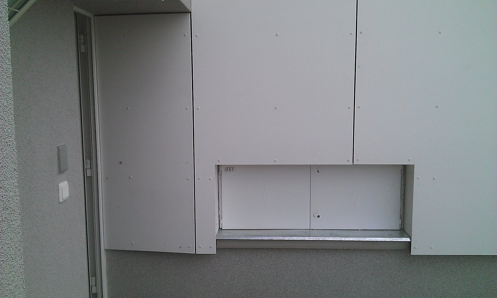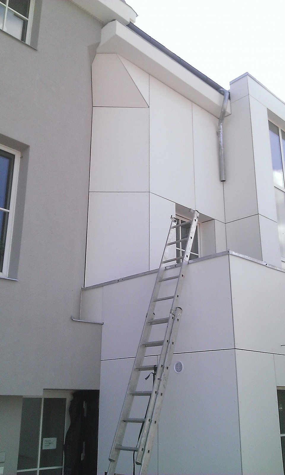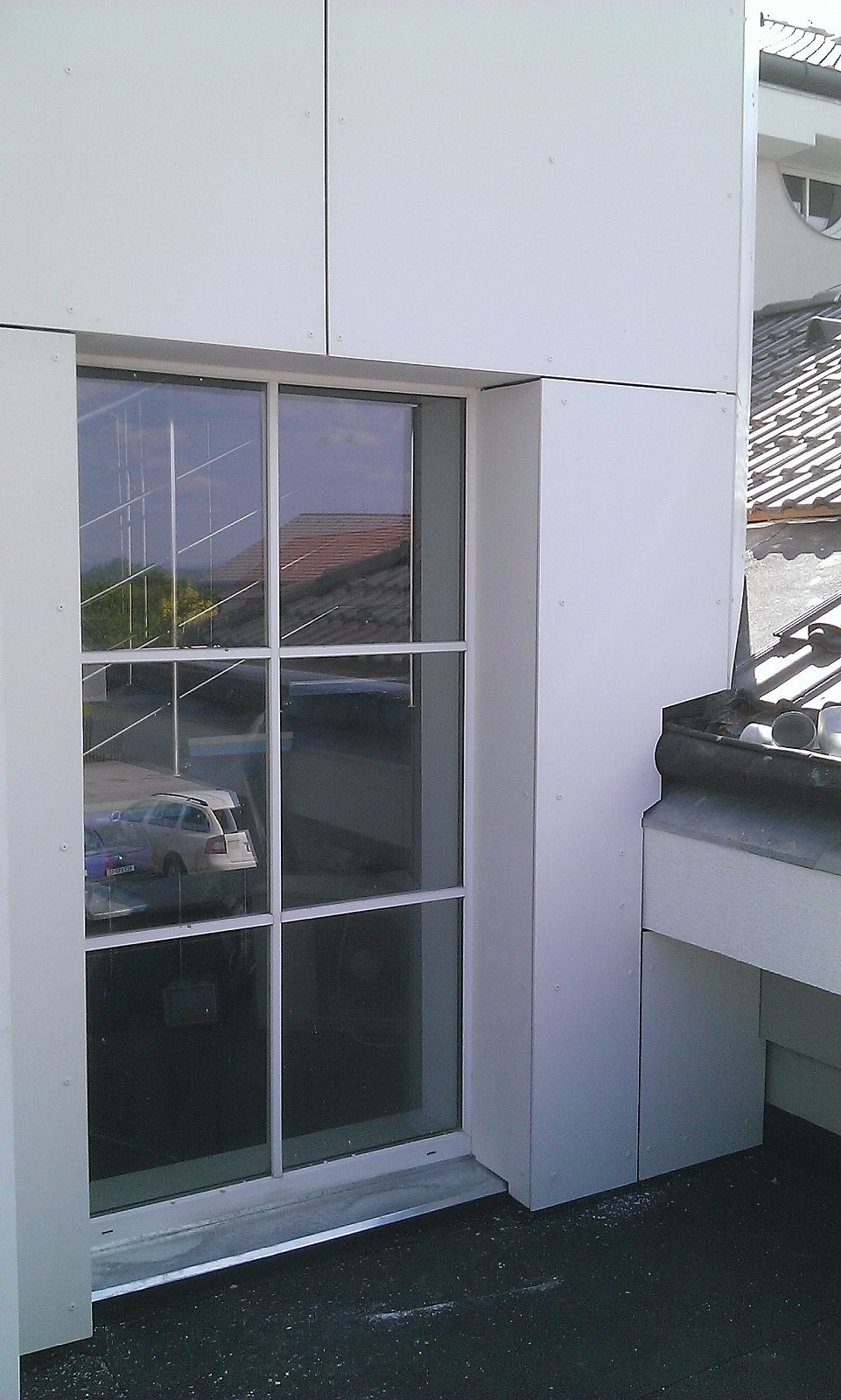 Obklad Silbonit Super Bianco, uchycený velkoplošnými nýty.