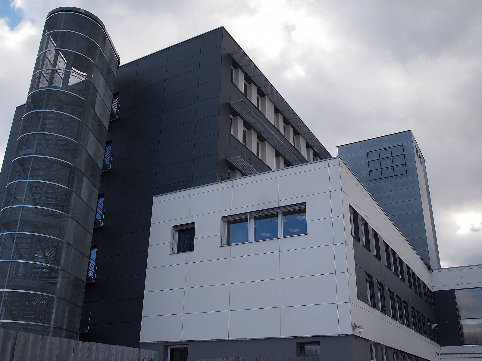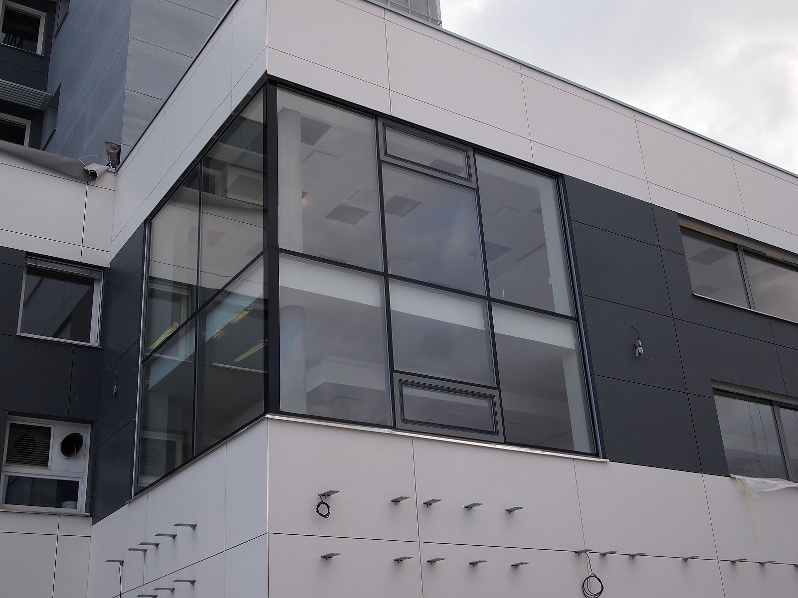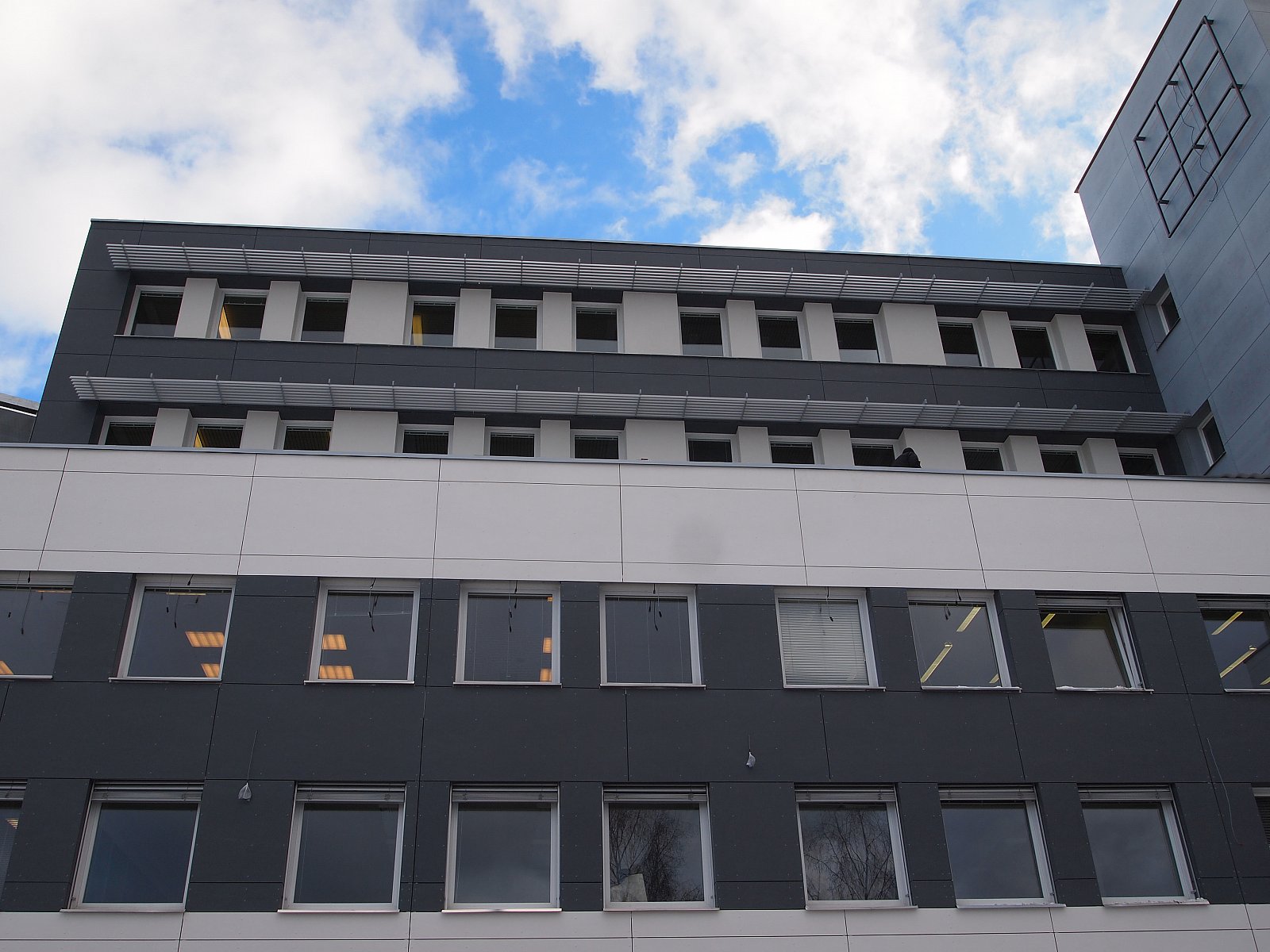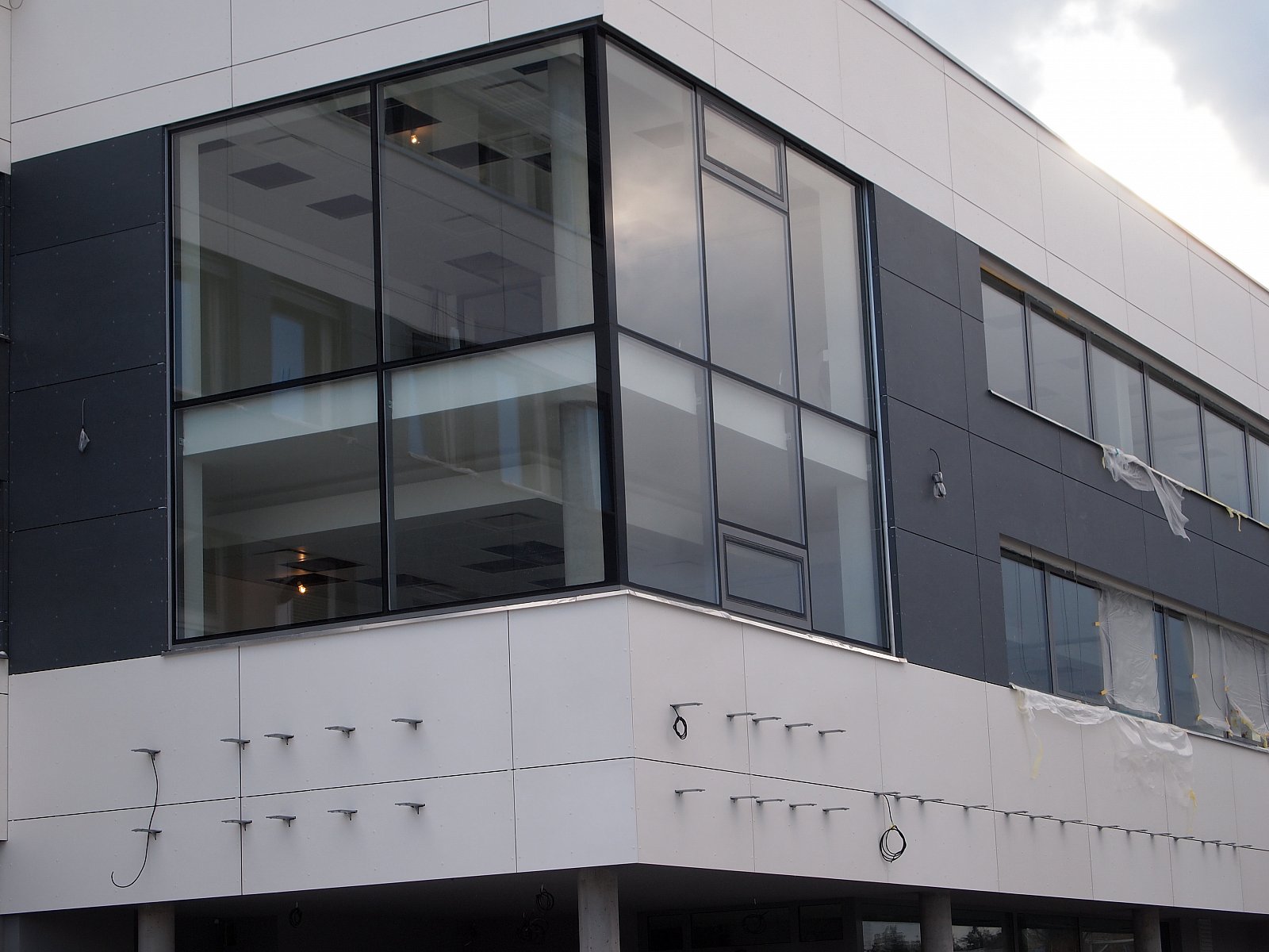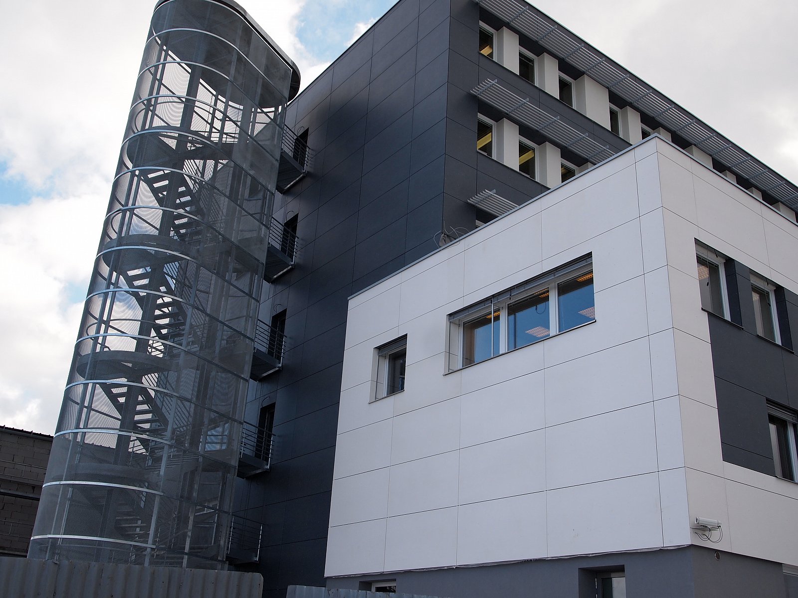 Realizace silbonitové fasády na továrně ŽDAS ve Žďáru nad Sázavou. Obklad silbonit, uchycen velkoplošnými nýty, montáž slunolamů a žaluzií.