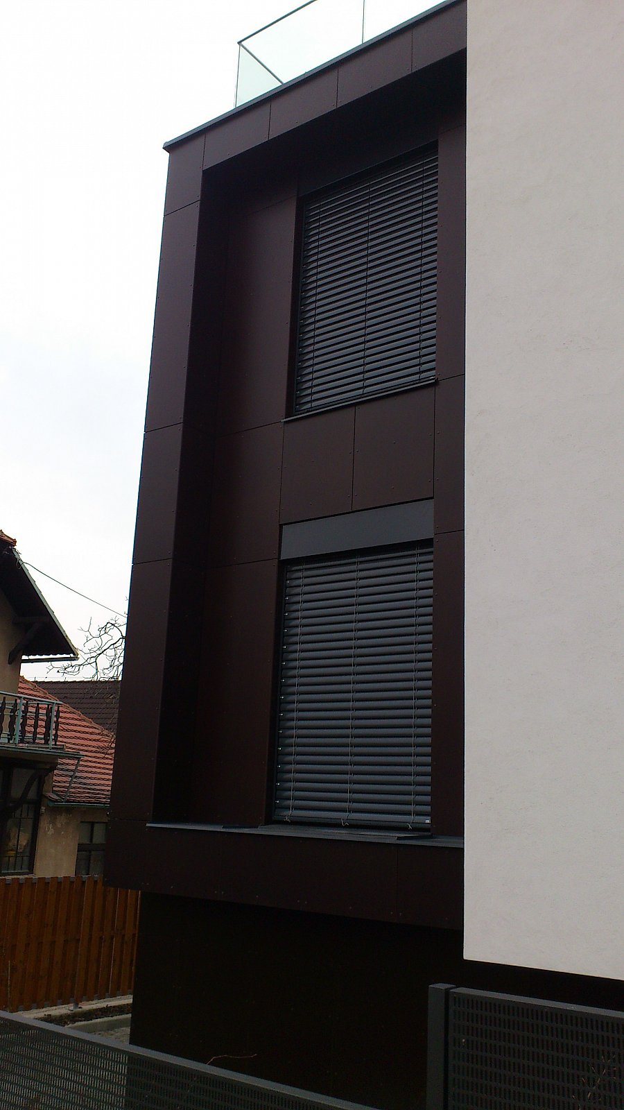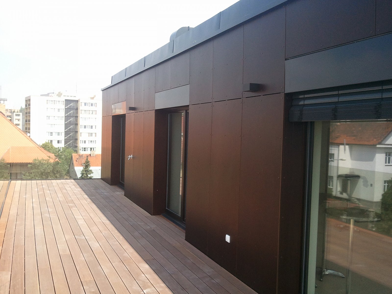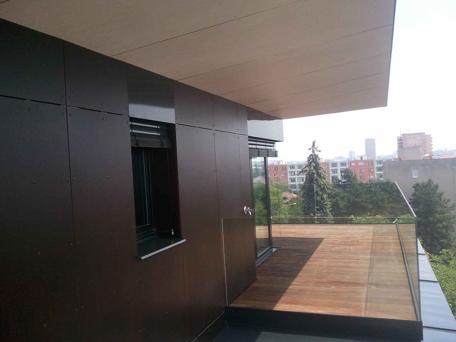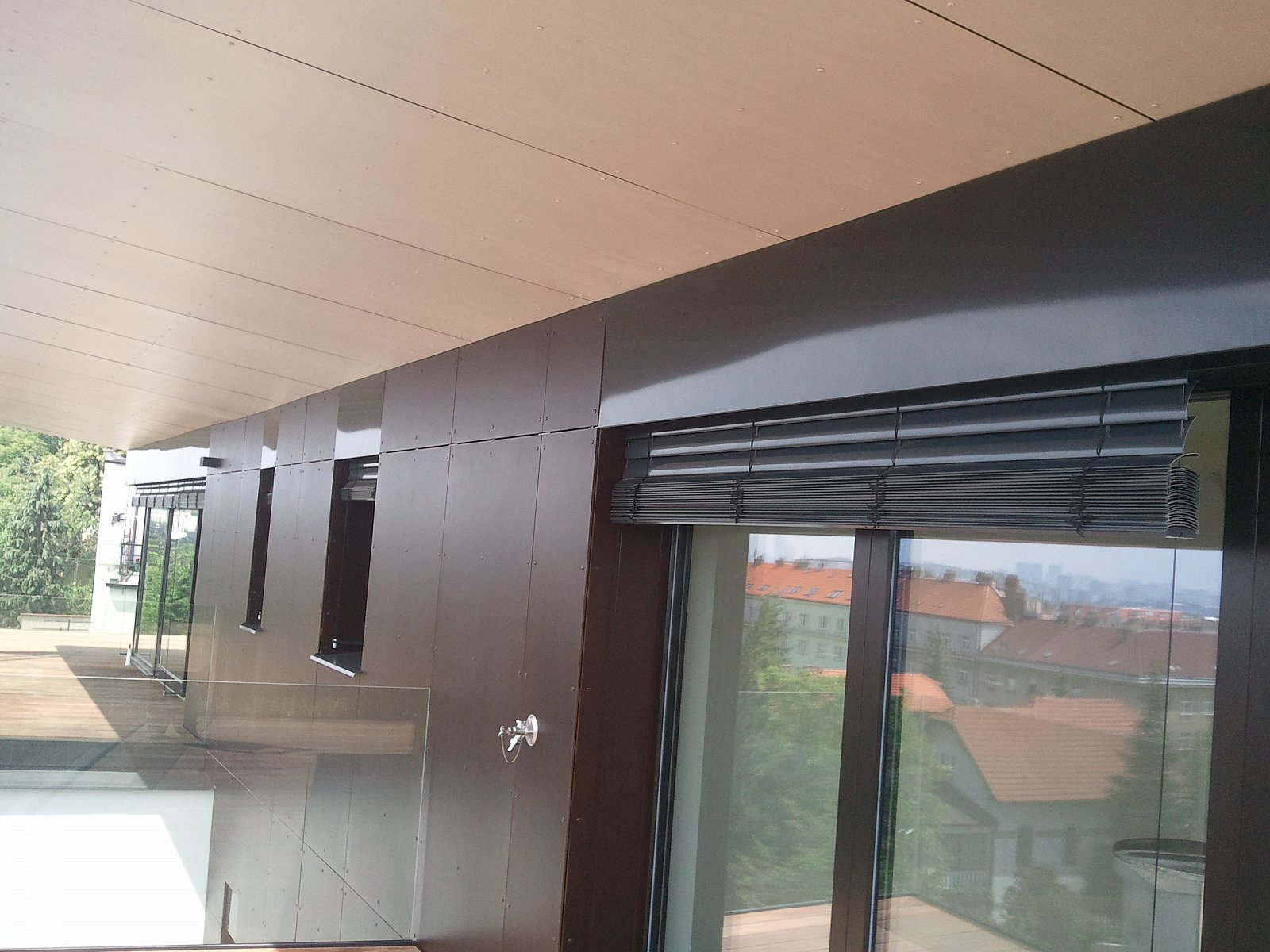 Obklad Parklax Antra, uchycený velkoplošnými nýty, podhledy Parklex Quartz, uchycené velkoplošnými šrouby do dřevěné konstrukce.