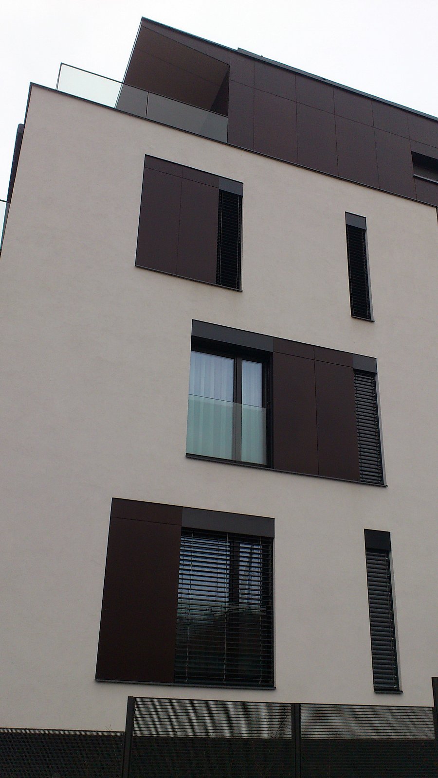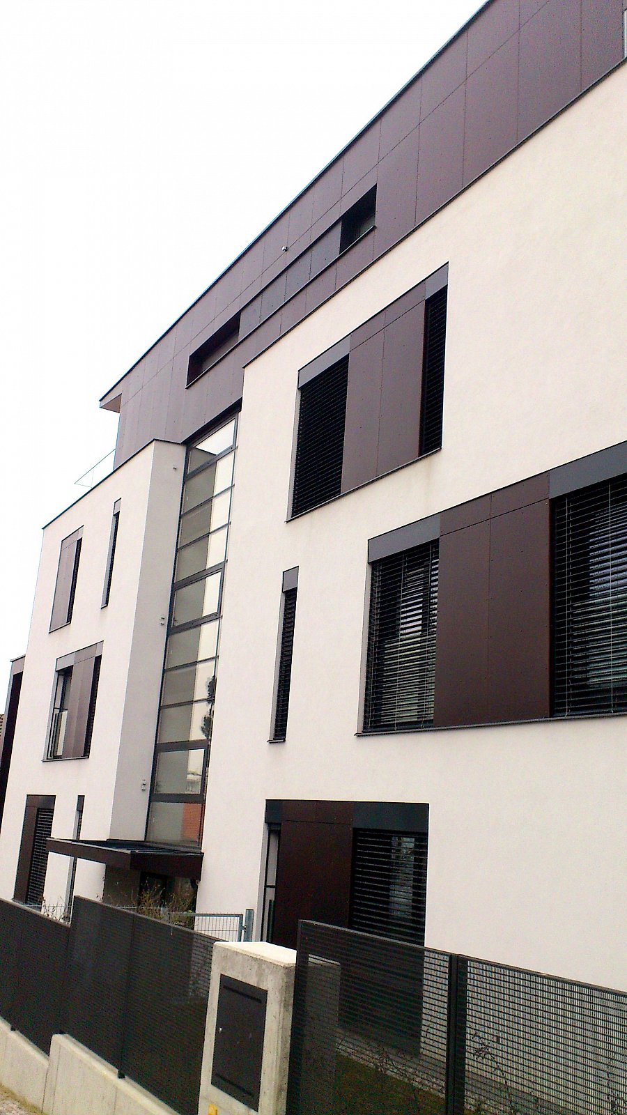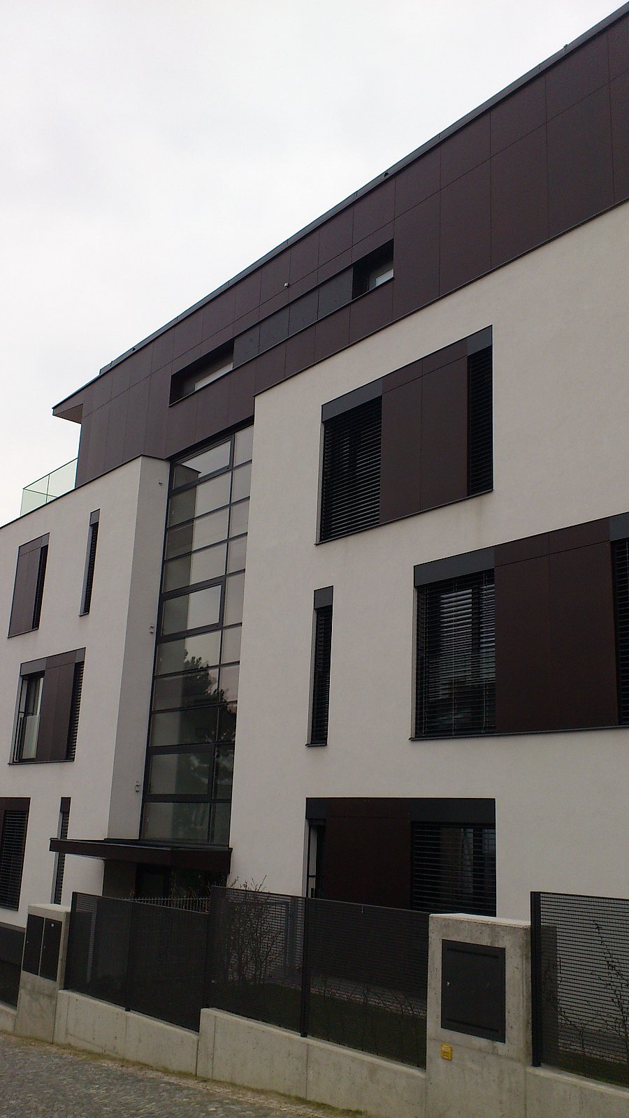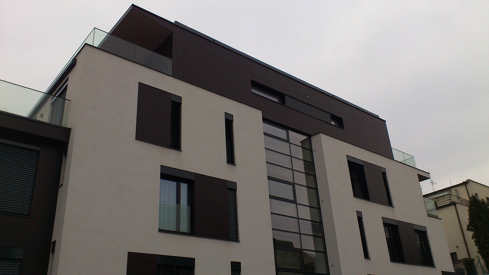 Obklad Parklax Antra, uchycený velkoplošnými nýty, podhledy Parklex Quartz, uchycené velkoplošnými šrouby do dřevěné konstrukce.