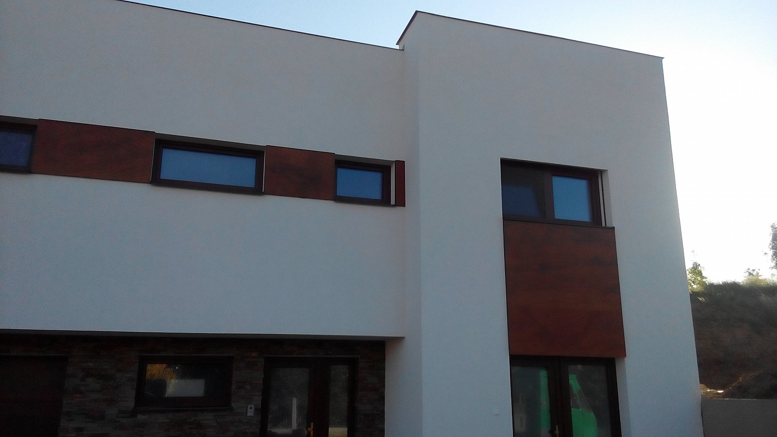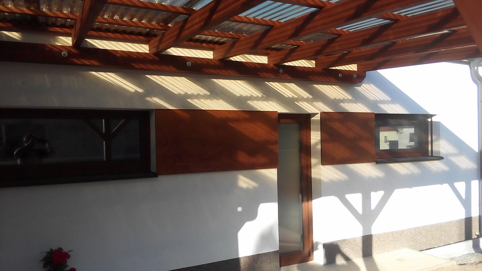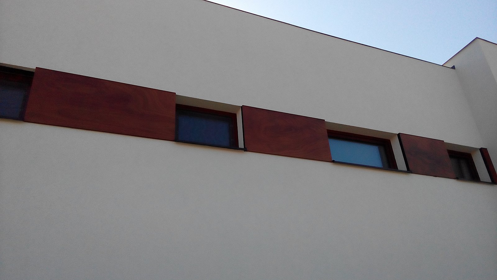 Obklad Parklex Copper, upevněn velkoplošnými nýty.