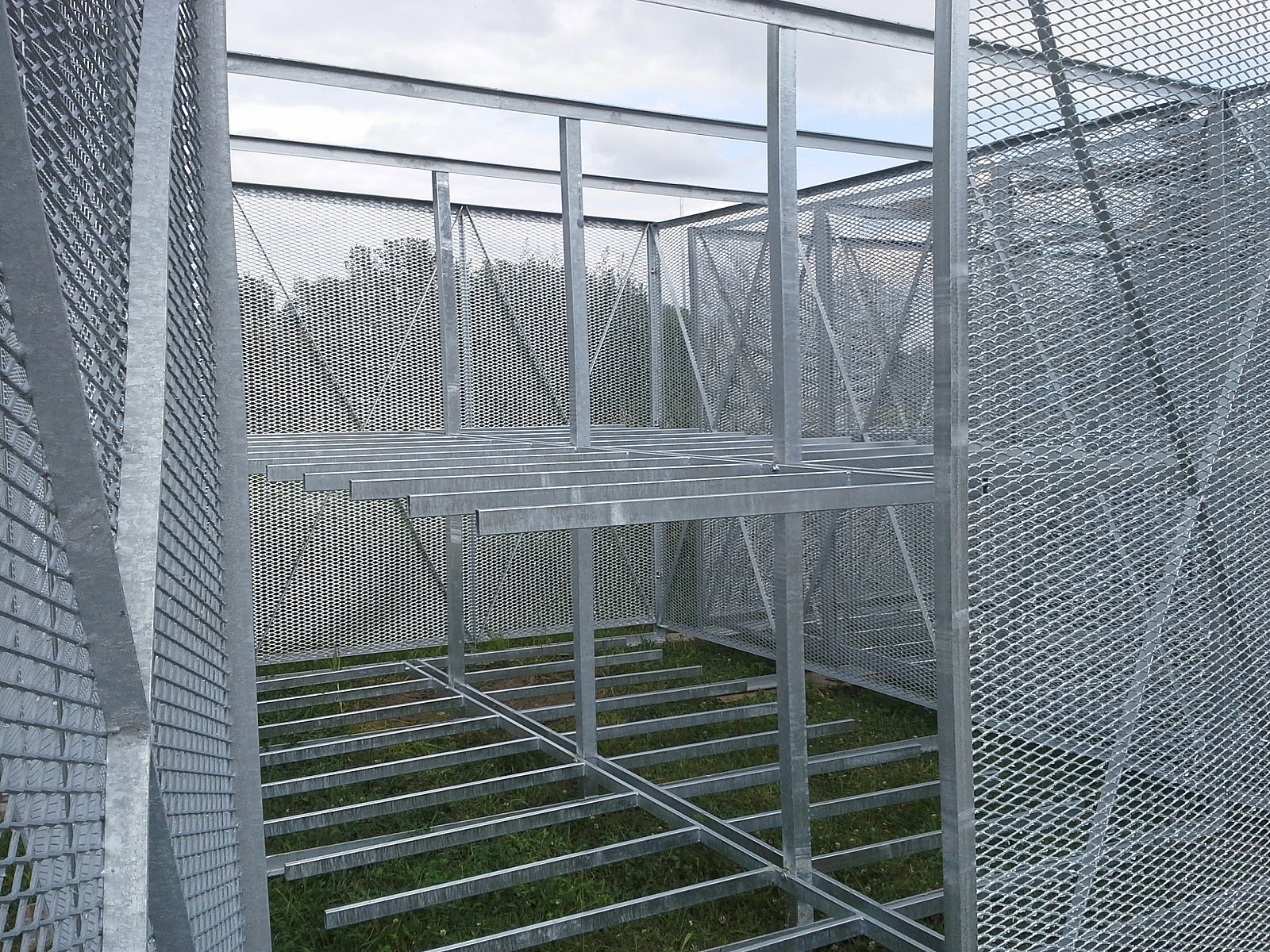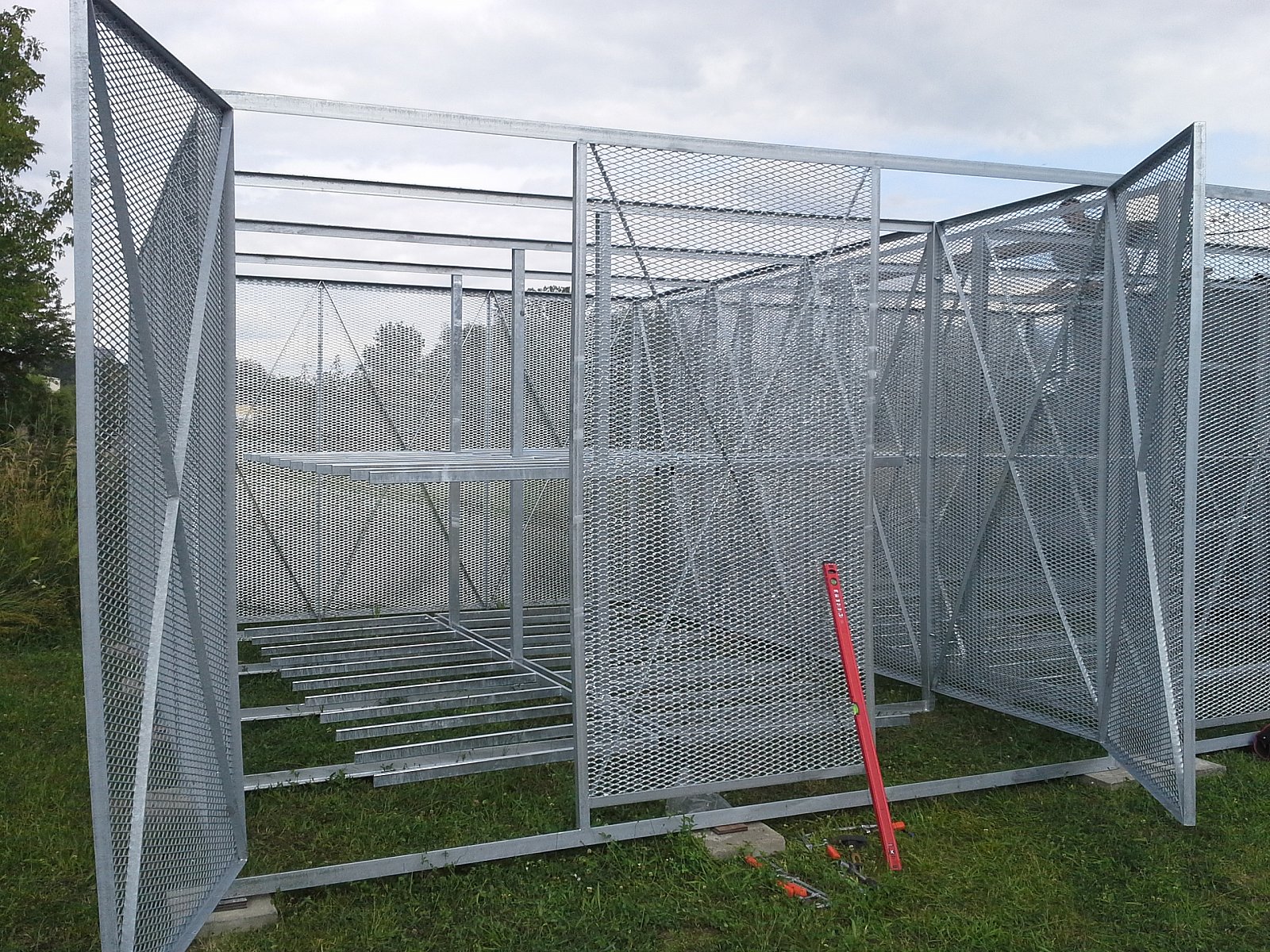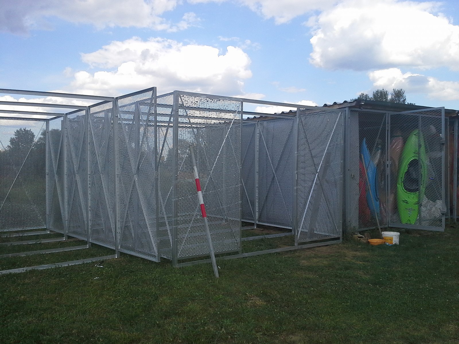 Pozinkované konstrukce opláštěné tahokovem, sloužící k uskladnění lodí.